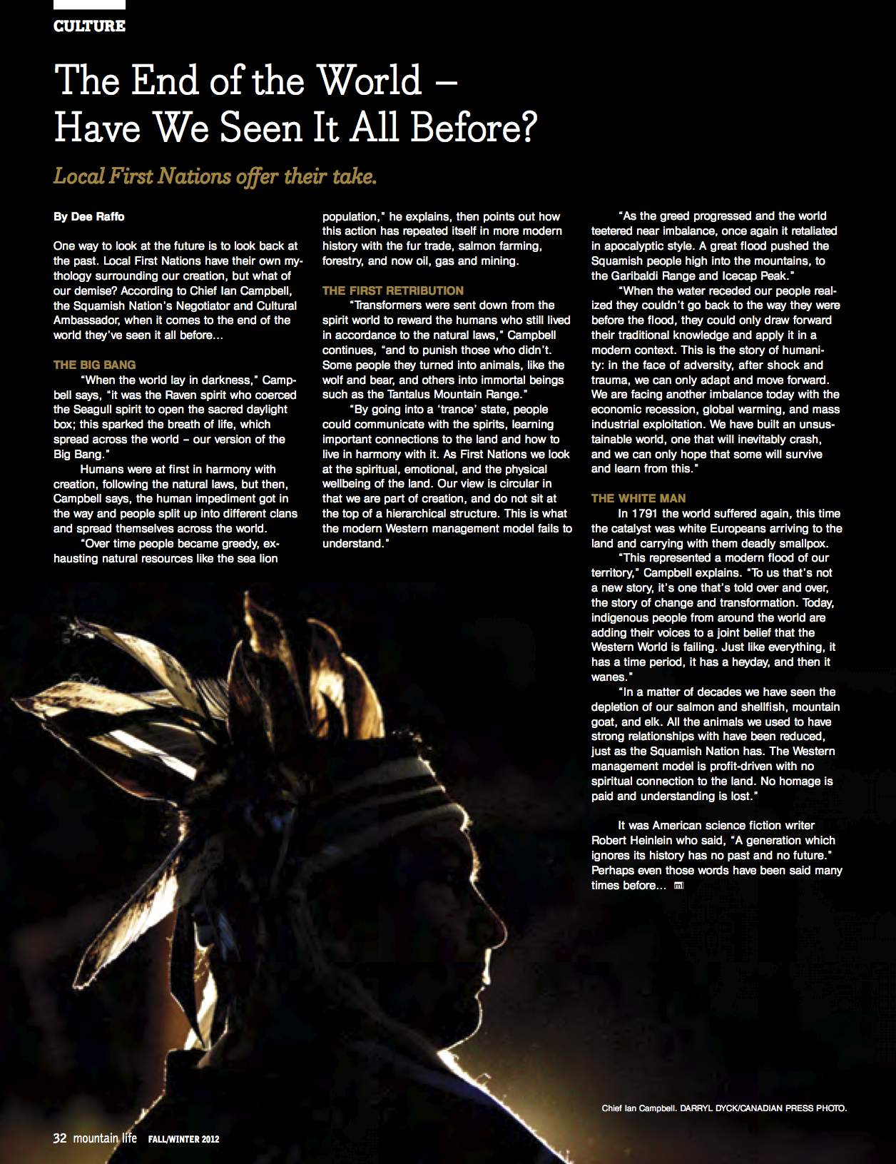 One way to look at the future is to look back at the past. Local First Nations have their own mythology surrounding our creation, but what of our demise? According to Chief Ian Campbell, the Squamish Nation’s Negotiator and Cultural Ambassador, when it comes to the end of the world they’ve seen it all before…read more here.